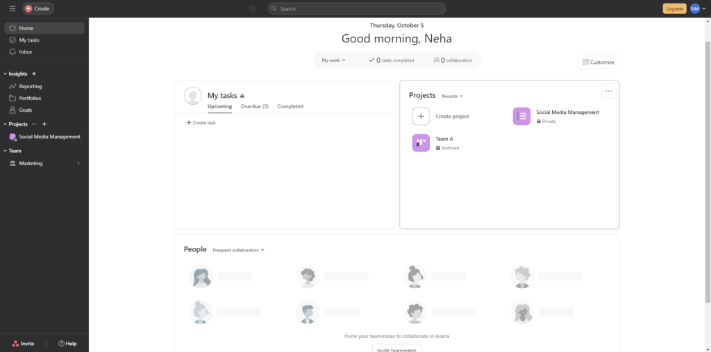 Asana’s user interface is also simple and intuitive. You can find an easy-to-navigate tab on the left panel containing My Tasks, Inbox, Insights which has reporting, portfolios, goals, and Projects. Then, you can also view your Team.